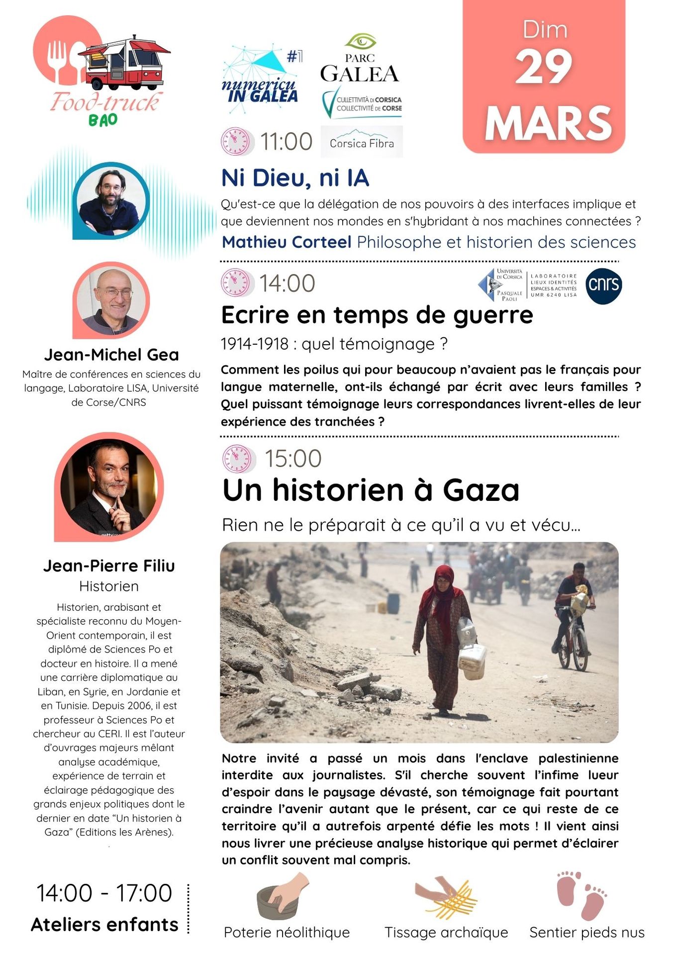 29 mars 2026 Conférences Jean-Pierre Filiu 11h : NI DIEU, NI IA (Mathieu Corteel) 14h : ECRIRE EN TEMPS DE GUERRE (Jean-Michel Gea)